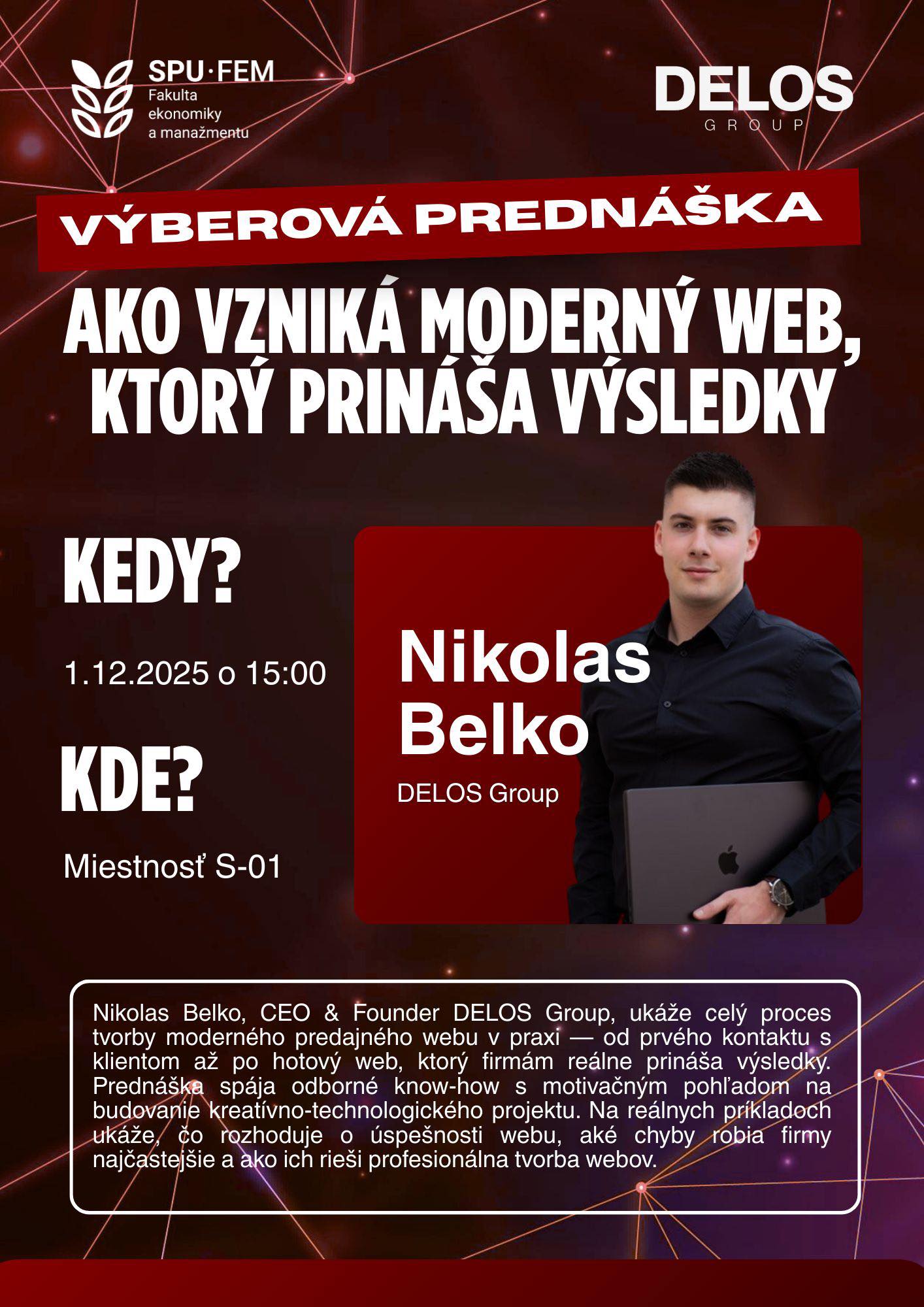 Nikolas Belko, CEO [&] Founder DELOS Group, ukáže celý proces tvorby moderného predajného webu v praxi — od prvého kontaktu s klientom až po hotový web, ktorý firmám reálne prináša výsledky. Prednáška spája odborné know-how s motivačným pohľadom na budovanie kreatívno-technologického projektu. Na reálnych príkladoch ukáže, čo rozhoduje o úspešnosti webu, aké chyby robia firmy najčastejšie a ako ich rieši profesionálna tvorba webov.